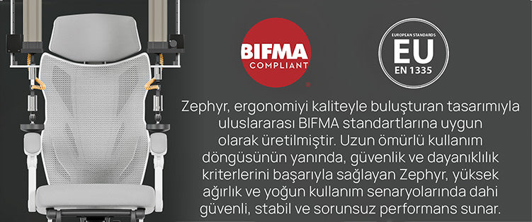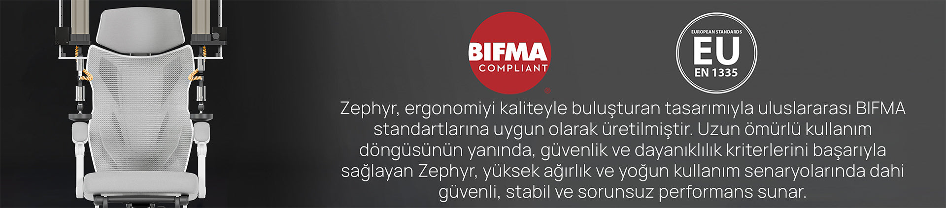 Zephyr, BIFMA sertifikalı Class 3 amortisörü ve güçlendirilmiş iskelet gövdesiyle 110 kg’a kadar ağırlığı güvenle taşır. Bu sağlam iskelet yapısı, sadece dayanıklılık değil, uzun yıllar boyunca stabil bir oyun deneyimi sunar. Sen oyunu taşı, Zephyr seni taşır.