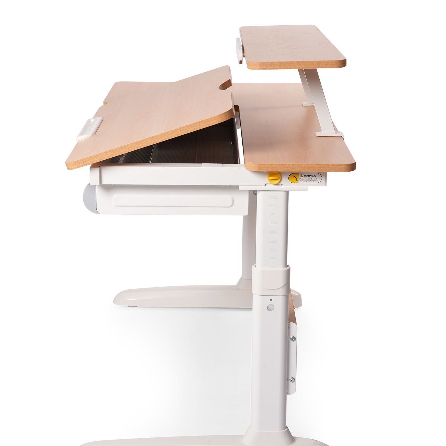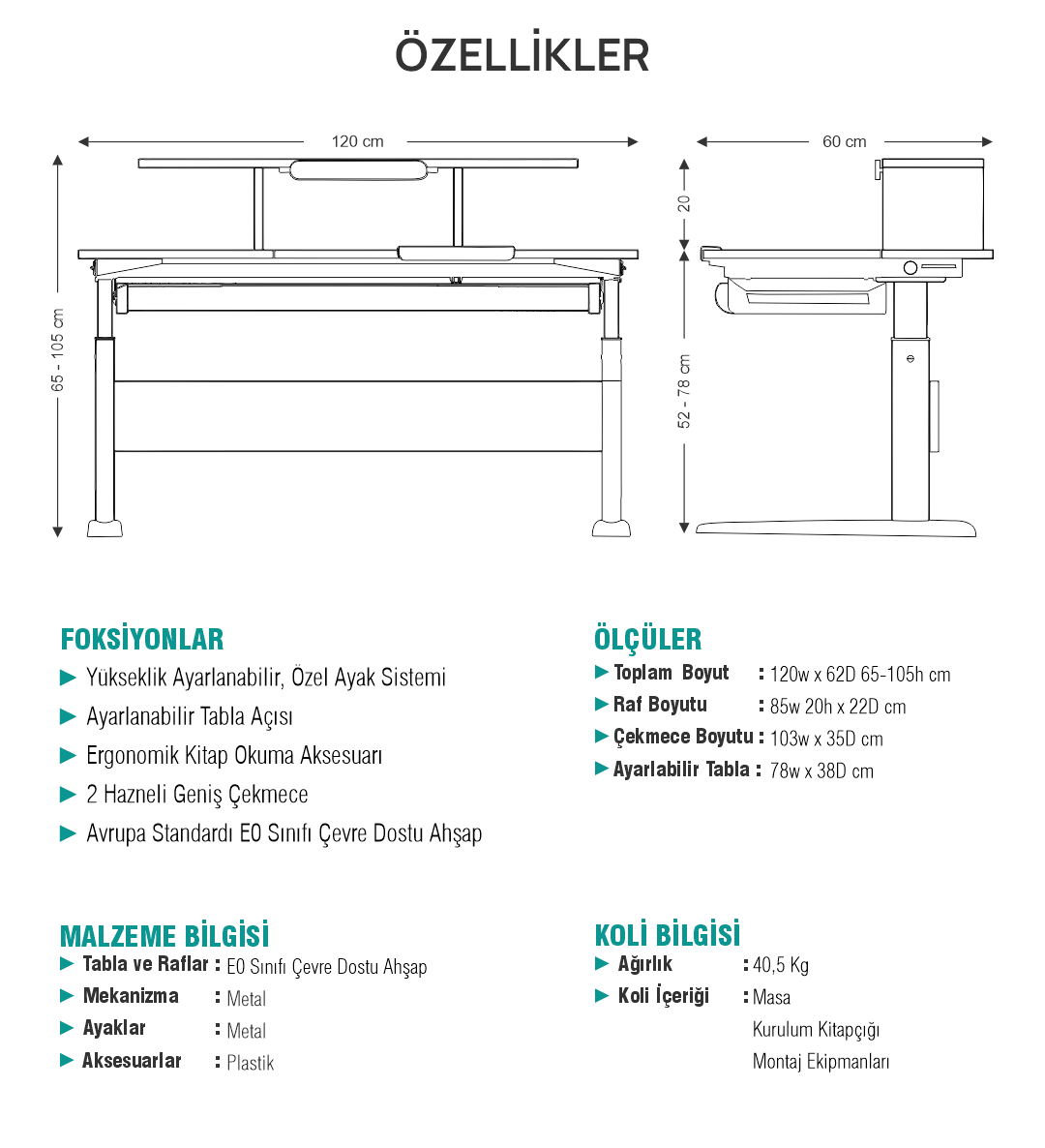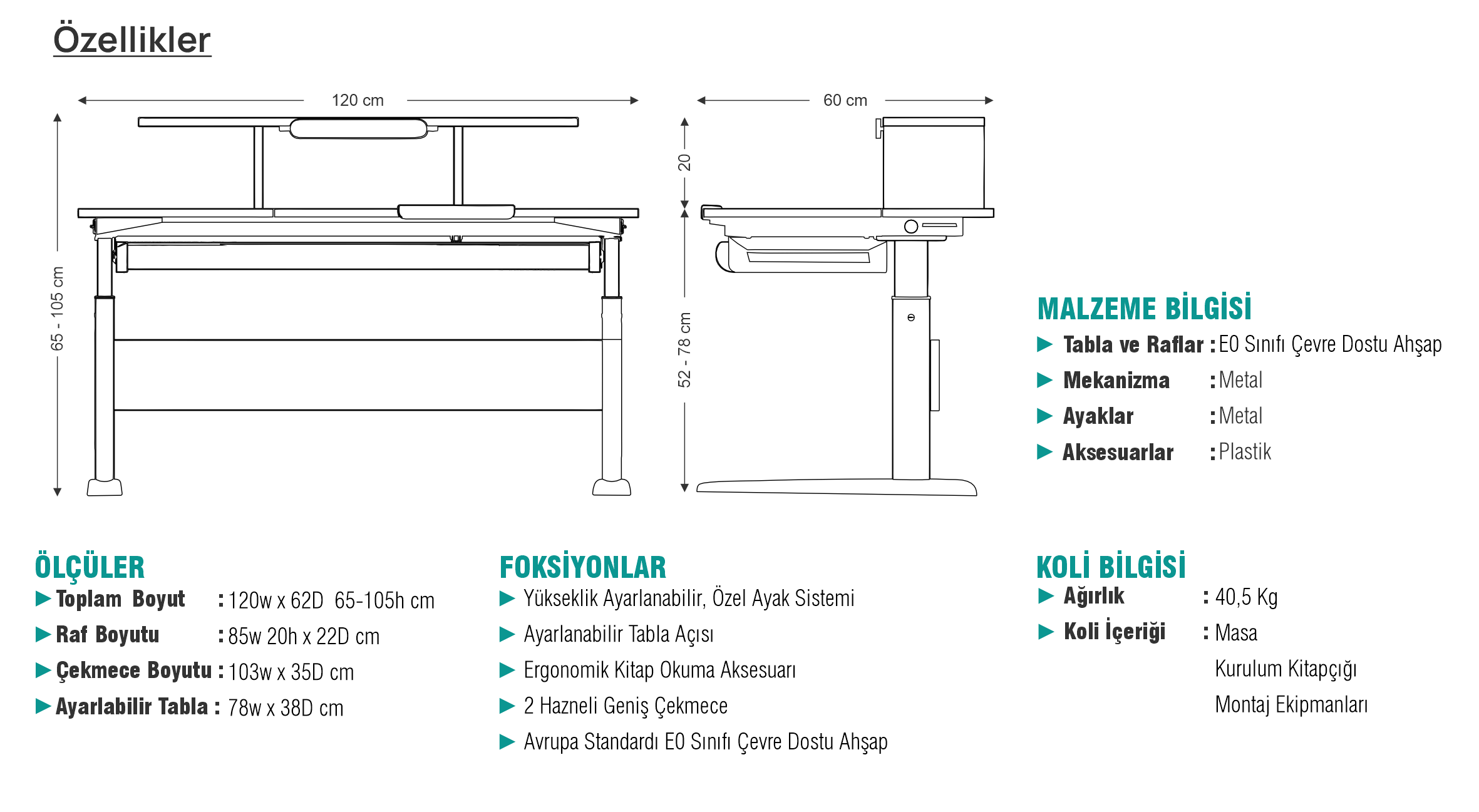 Akasya, 120x60 cm’lik geniş yüzeyiyle çocuğunuza ferah bir çalışma alanı sunarken; 40x80 cm’lik özel alanı, eğim verilebilen yapısıyla çizim, yazı ve kitap okuma gibi aktivitelerde ergonomik açı desteği sağlar. Akasya, her aktiviteye uygun bir yüzey sağlar.