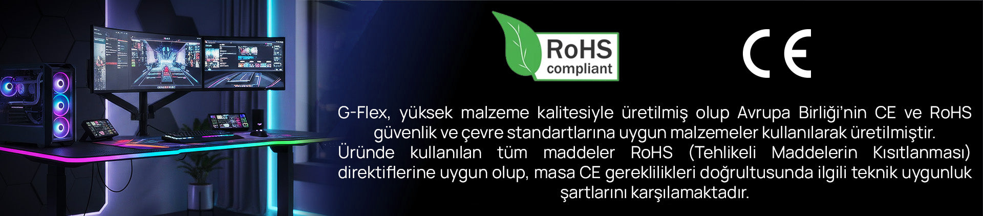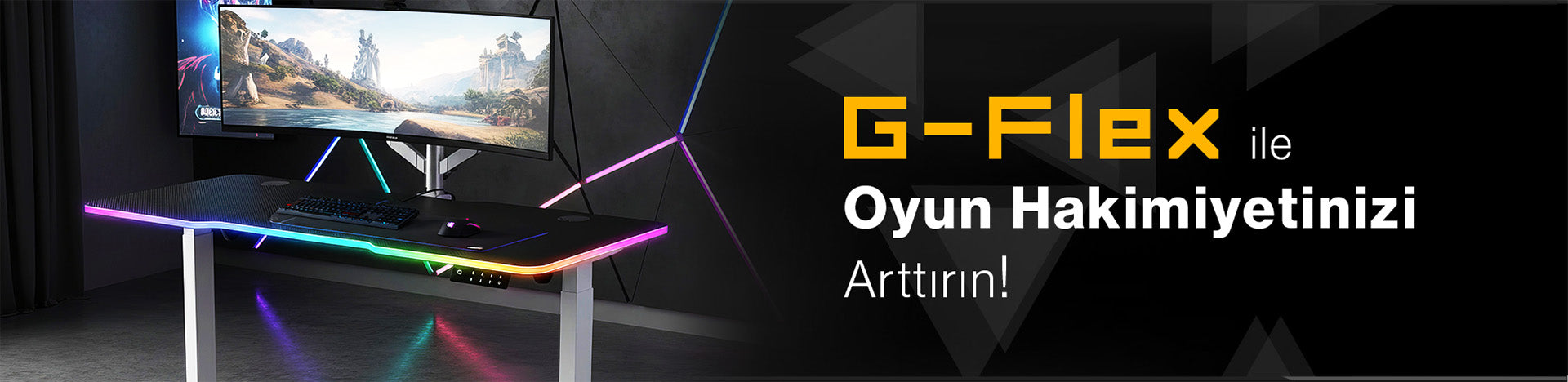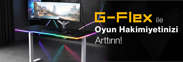 Saatlerce oyun başında kalan ve konforunu kaybetmeden rekabetin içinde kalmak isteyen oyuncular, yayın yaparken görünüm kadar ergonomiye de önem veren içerik üreticileri için geliştirildi. G-Flex Yükseklik ayarlı oyuncu masası, hem stil sahibi bir masa isteyen, hem de duruş sağlığından ödün vermek istemeyen herkese hitap eden özel bir oyuncu masasıdır. Kısacası: oyunu sadece oynayan değil, yöneten herkes için G-Flex.