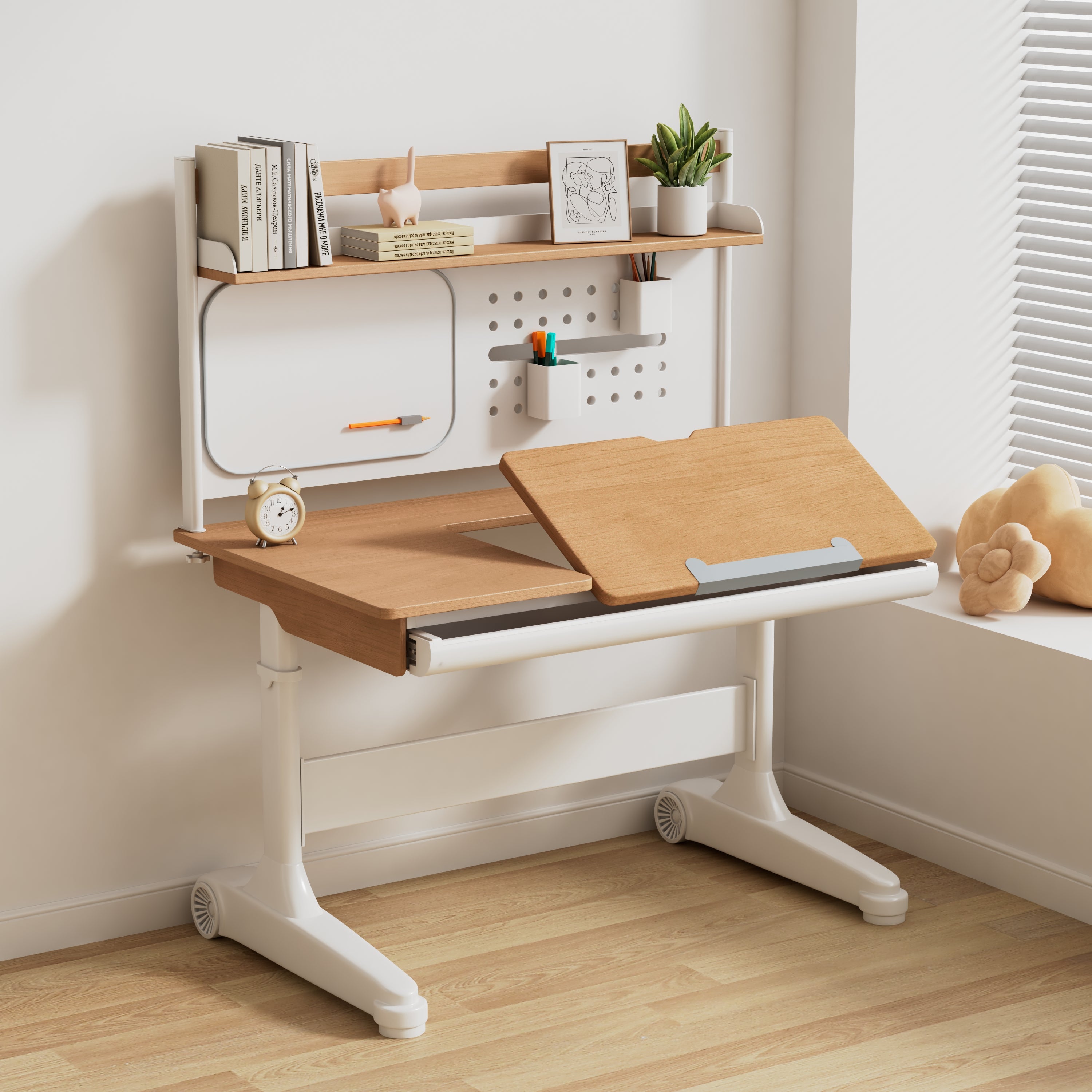 Mimosa’nın geniş raf yapısı, kitaplardan defterlere, sevilen oyuncaklardan küçük aksesuarlara kadar her şey için yeterli bir kullanım alanı sunar. Metal olarak tasarlanan arka panel, mıknatıslı notlar, aksesuarlar ve planlayıcılar için ideal bir alan oluşturur. Bu alan, çocuğun çalışma alışkanlıklarını kişiselleştirmesine olanak tanırken masayı daha eğlenceli ve işlevsel hâle getirir.
