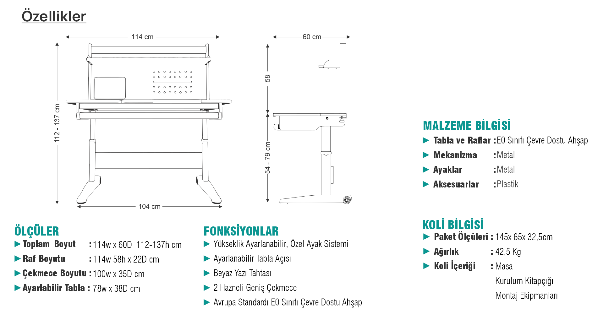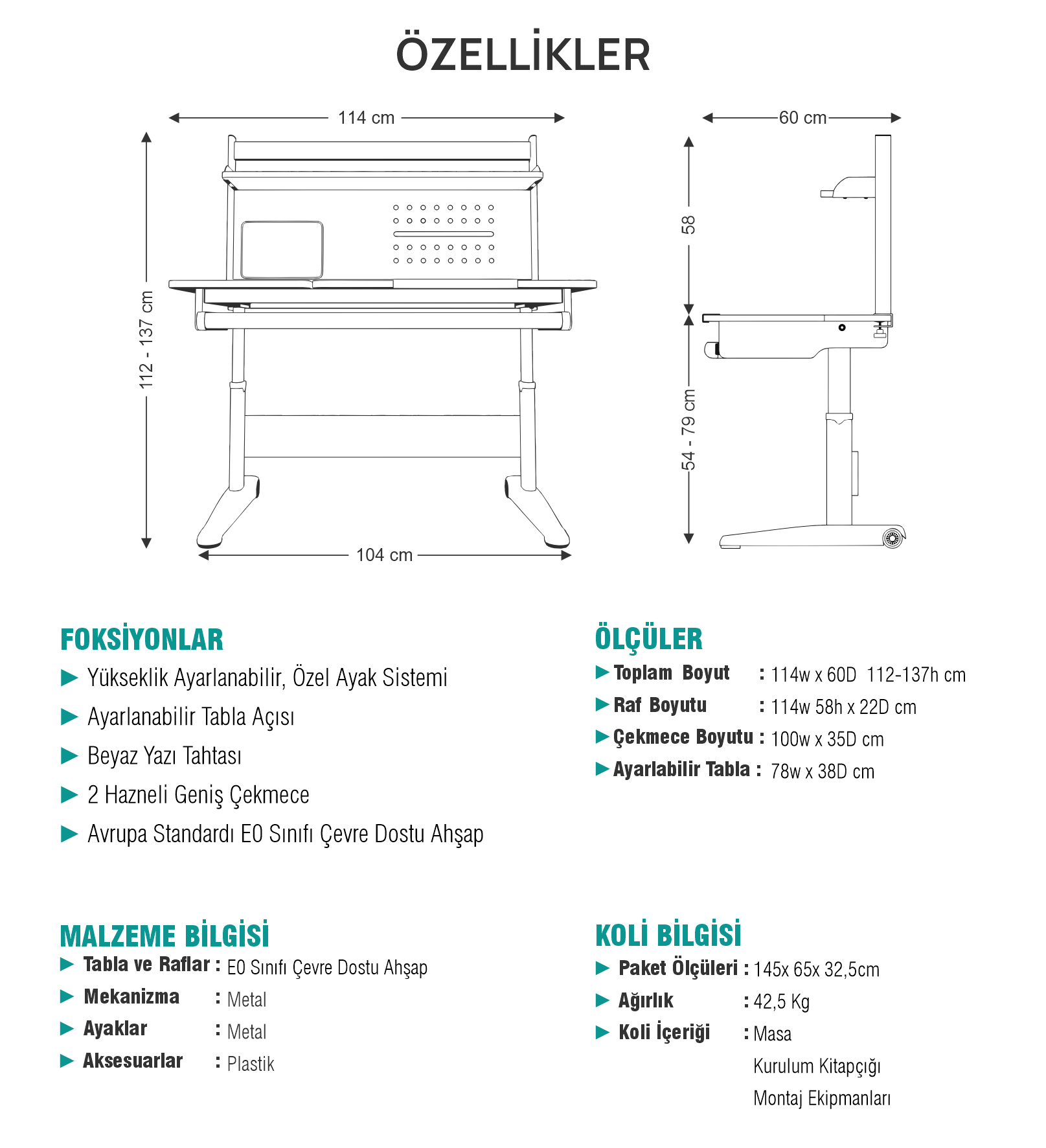 Oğluma aldık guzel ve rahat kullanışlı kaliteli bır masa rahatça kurabaıldık ancak beyaz tahta kucuktu gorundugu gubı degıl ama cekmecesı ve ayarlanabilir olması gayet guzel fiyatı pahalı bjraz ama omurluk bır masa