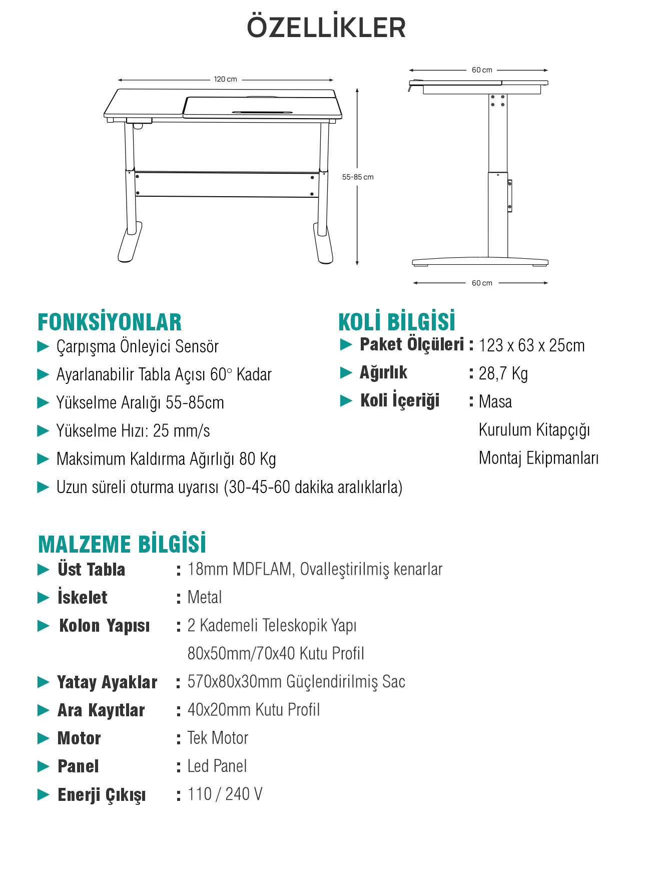 Gelişim çağındaki çocuklar için tasarlanan O-Flex Kidza, çocuklara ergonomik alışkanlıklar kazandırmak için geliştirilmiş elektrikli yükseklik ayarlı bir çalışma masasıdır. 55–85 cm aralığında ayarlanabilen yüksekliği ve 60°'ye kadar eğilebilen tabla yapısı, çocuğun beden yapısına ve çalışma pozisyonuna tam uyum sağlar. Ovalleştirilmiş kenar tasarımı güvenliği artırırken, 80 kg taşıma kapasitesi uzun ömürlü ve sağlam bir kullanım sunar. Her çocuk farklı şekillerde öğrenir, O-Flex Kidza da bu farklılıklara uyum sağlar.